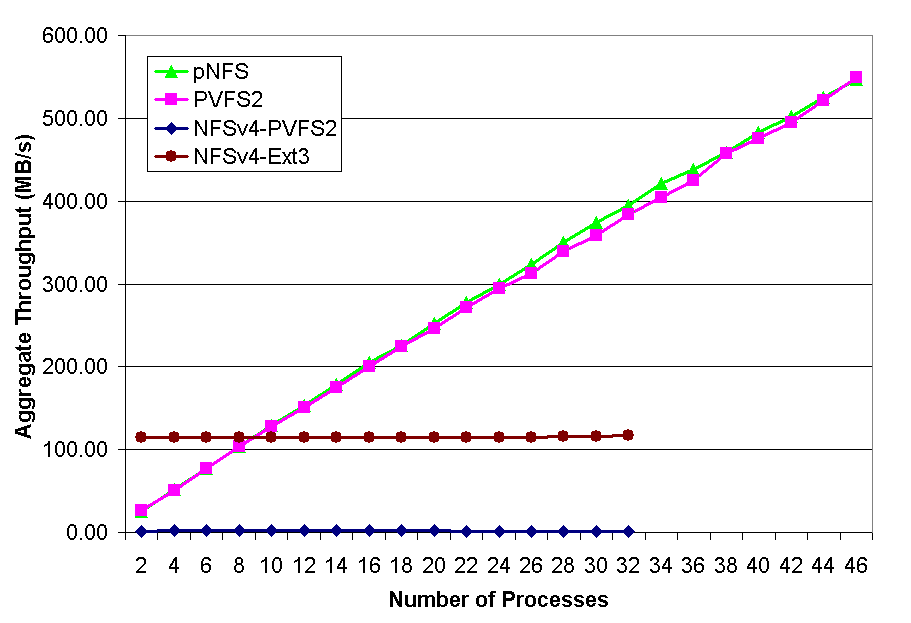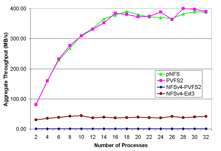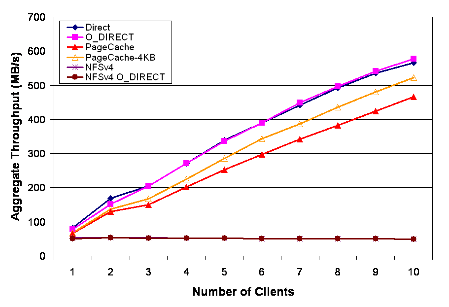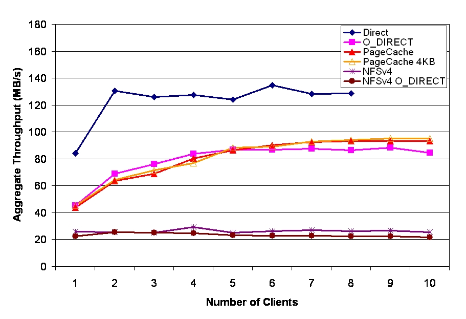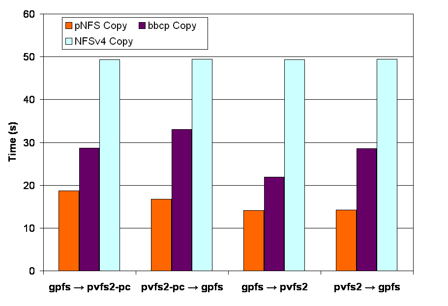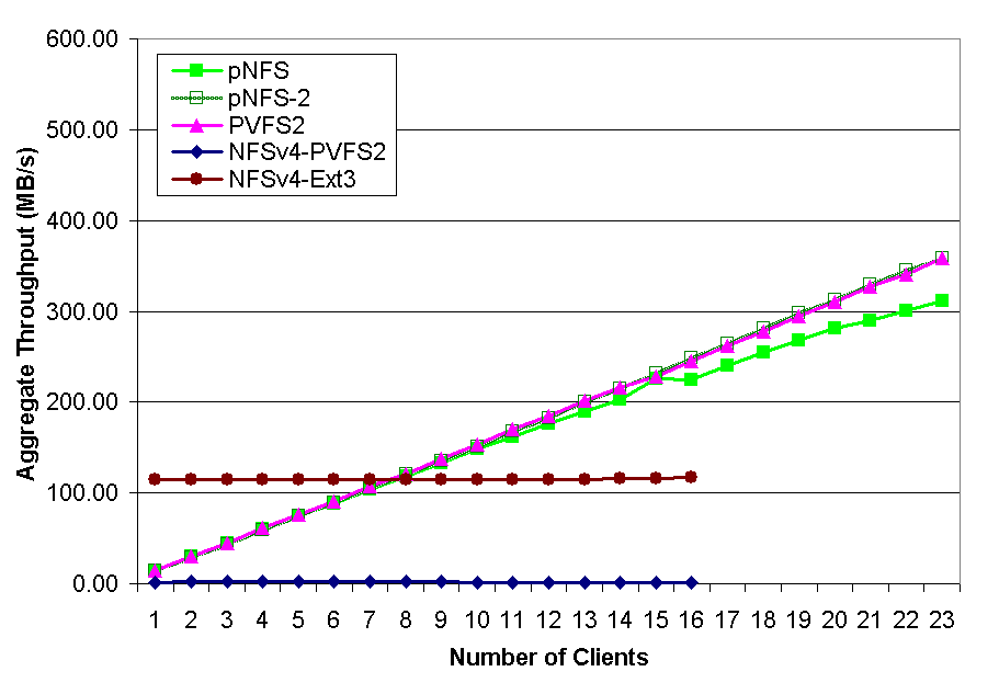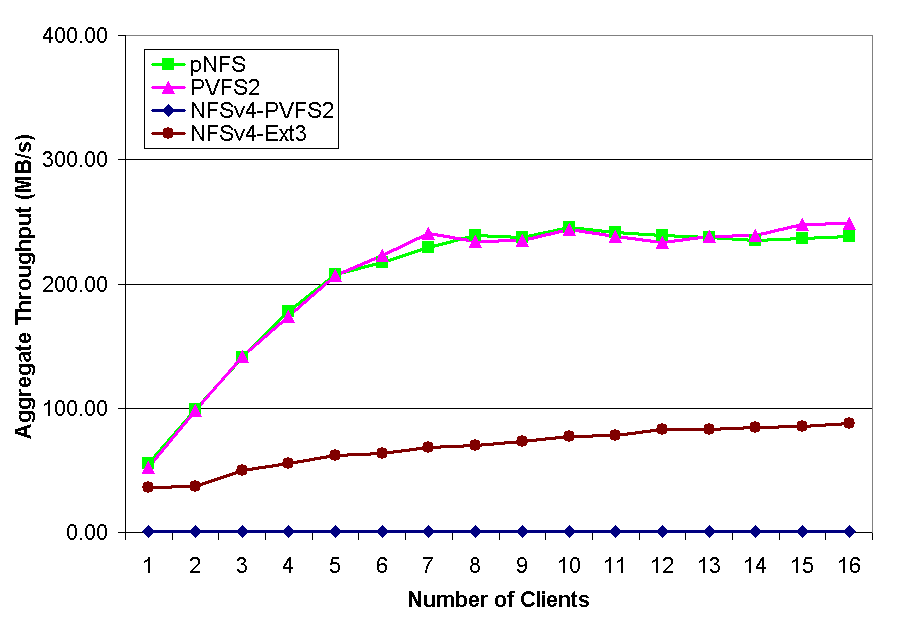 Experiments SummaryThe following experiments demonstrate the ability of pNFS to match the superior performance of the exported high performance file system. Please feel free to use these graphs in your pNFS-related presentations or documents. Details of most experiments can be found in their associated paper.Original pNFS/PVFS2 Experiments