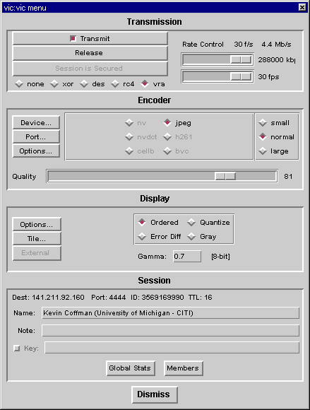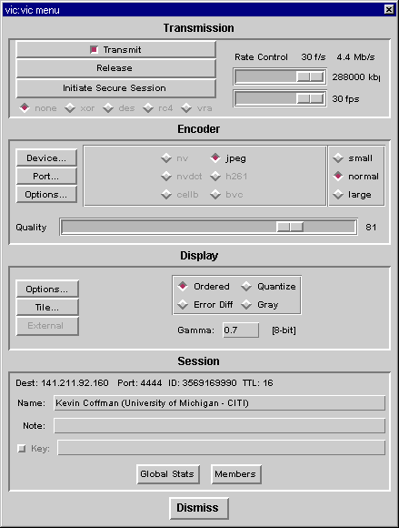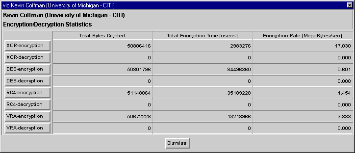 Secure Videoconferencing Project This project is based on VIC and VAT, the Internet real-time, multi-party videoconferencing tools developed at Lawrence Berkeley National Laboratory. VIC and VAT are based on the Draft Internet Standard Real-time Transport Protocol (RTP), developed by the IETF Audio/Video Transport working group. RTP is an application-level protocol implemented entirely within VIC and VAT, so the tools run without any operating system enhancements. Although they can be run point-to-point using standard unicast IP addresses, VIC and VAT are primarily intended as multiparty conferencing applications using IP multicast over the IP Multicast Backbone (MBONE). VIC offers optional DES encryption, and a weak XOR cipher that provides a best-case performance baseline. Viewgraphs from 11/97 presentation at IBM Hawthorne. ps.gz, pdf , Provably Secure Videoconferencing, CITI Technical Report 97-2. Additions to VICIn order to create a useful security test bed, we needed the ability to both initiate a secure VIC session and to select encryption ciphers on the fly. We also needed to be able to add ciphers and key exchange algorithms, so we implemented the changes to VIC using the GSS API as an interface between VIC and the security components we wish to test. VIC uses two ip streams, the control stream and the data stream. We integrated our GSS API security modules to utilize both streams - using the control stream for key exchange components, and the data stream for encryption components. We support unicast key exchange. Distributing keys for secure multicast to a large group is currently being investigated and implemented. Working with Personal Cipher Card Corp., we have implemented Bellcore's Shoup-Rubin protocol, a smartcard-based version of a Leighton-Micali key exchange on the SGS-Thomson ST16612 smartcard. Menu ModificationsUsers are presented with a modified VIC main menu that allows either the sender or receiver to initiate security any time during the VIC session. Triggering the Initiate Secure Session button results in a message sent to the other end of the unicast over the VIC contol channel, and the user is asked if they want to start a secure session. If the Yes button is selected, a choice of ciphers is presented to each party. If the No button is selected, initiator is notified. Note that for the transmitter, their chosen cipher is used to encrypt both the control and data channels while for the receiver, their choice of cipher encrypts the return control channel. Once both parties have chosen a cipher and the smartcard key exchange succeeds, the main menu's Initiate Secure Session button is changed to show Session is Secured, and the choice of cipher is highlighted in red. Either party can change ciphers on the fly simply by choosing a different cipher from the transmit menu. The current choices are none, XOR, DES, RC4, and VRA, Bellcore's new Video Rate Algorithm. We then compare performance of the software ciphers and show the results in a statistics window. Platforms and CodecsSecure video transmission over the internet has its performance challenges. Working with full-motion (30 frames per second) 24-bit color 320x240 images, we need to move almost 7MB/sec (megabytes per second) from the "camera server" to the "screen server" through computers and networks. This is impractical, so we must compress the video stream. Software encoding demands more cpu cycles than our workstations can provide, so we turn to hardware for this service. We found that once we performed video compression in hardware, we have enough cpu cycles to do software encryption. Our choice of workstation hardware was limited by the availability of hardware video codecs. There are many new products evolving in this market, and we expect the commodity PC market to eventually meet our needs. We augmented the rs6000 port of VIC to take full advantage of IBM's UltiMedia Services (UMS) hardware and software, including hardware MJPEG encoding and decoding. UMS gives high quality video transmission at 30 frames per second, which requires a bandwidth of approximately 4.0 MB/second. We augmented the Win32 port of VIC to utilize the hardware MJPEG encoding and decoding capabilities of the miroVIDEO DC20.