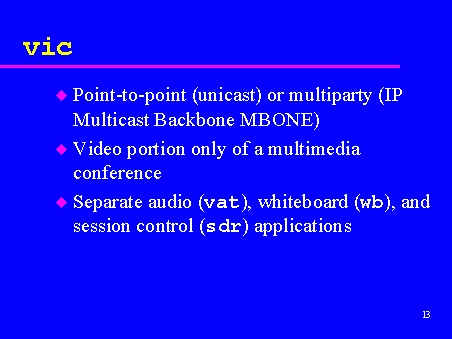 - Interoperates with ISI's Multimedia Conference Control (mmcc), the Xerox PARC Network Video tool (nv), INRIA Video-conferencing System (ivs).